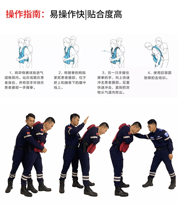 救援培训专用窒息梗塞急救实训穿戴马甲,可有效避免因窒息急救不及时导致生命安全受到伤害。防窒息急救教育和实训的时候,穿戴在学员身上,针对异物造成的呼吸气道堵塞状况时,练习腹部按压(即海姆立克手法),做出正确步骤处理,挤出堵塞气道异物(异物塞).直观的教学模式给学员带来自信和应用实效。模拟者可采用站姿、坐姿、用教具或借助柜台、桌椅,实习体验窒息自救、急救、达到救人一命的教学目的。